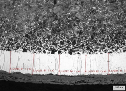 總脫碳層的測定—-在中碳鋼、低合金鋼中是以鐵素體與其他組織組成的相對(duì)量變化來區(qū)分的。借助于測微目鏡或直接在顯微鏡毛玻璃屏上測量從表面到其組織和基體組織已無區(qū)別的那一點(diǎn)距離。對(duì)每一試樣,在最深的均勻脫碳區(qū)一個(gè)視場內(nèi),應(yīng)隨機(jī)進(jìn)行幾次測量(至少需5次),以這些測量值的平均值作為總脫碳層深度。